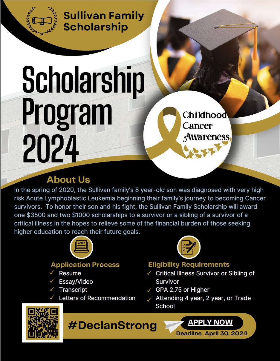 To show their gratitude for community support, the Sullivans have now created a family scholarship for any local senior who is a critical illness survivor or the sibling of a survivor, and who plans to attend a four-year, two-year or trade school after high school.