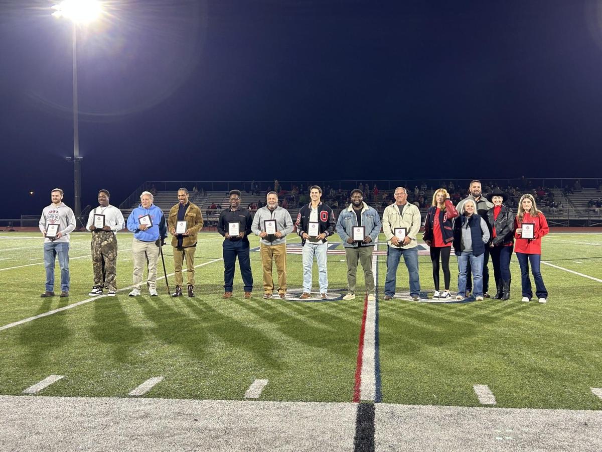 Inductees present for ceremony on Nov. 7 include left to right: Garrett Taylor, Jeron Rooks, William "Butch" Vaughn, Lazarius Patterson, Xavier Myers, Mike Young, Jackson Cauthen, Christian Cantrell, Johnny McCrary, and the family of Jonathan Lee. Honored previously: Coach Melvin Daniels, Sr., and George Gbeese.