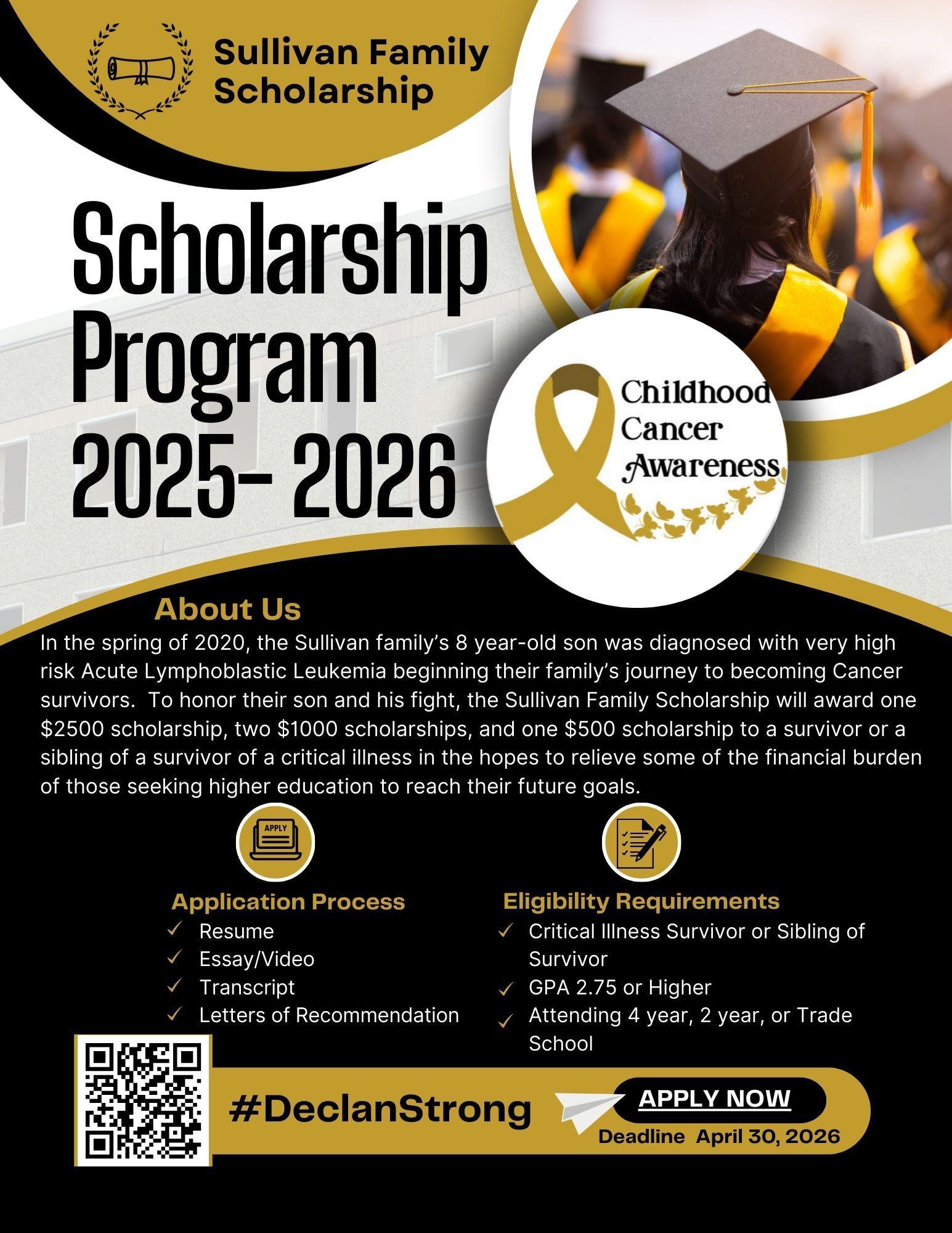 Director of Schools Dr. Jimmy Sullivan and his family are seeking applications for their Sullivan Family Scholarship. A total of four scholarships will be awarded to a survivor or a sibling of a survivor of a critical illness. A full description, the application, and the requirements are included on the attached handout. All applications are due April 30, 2026. Winners will be announced in May.